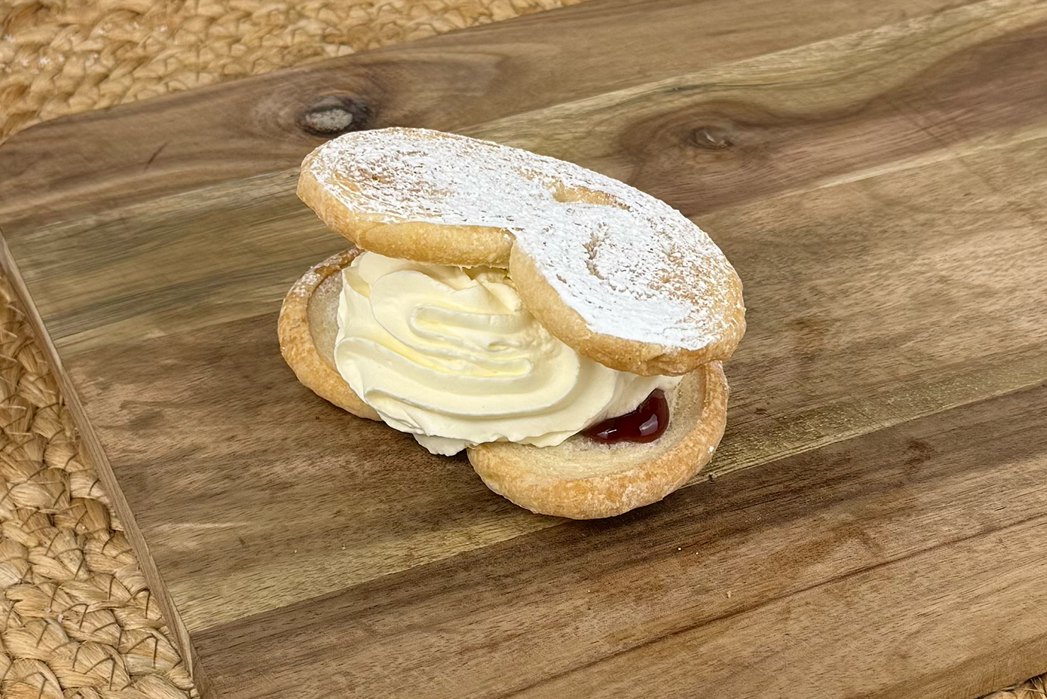 Two light sponge rounds sandwiched with fresh cream and jam, a timeless bakery staple.