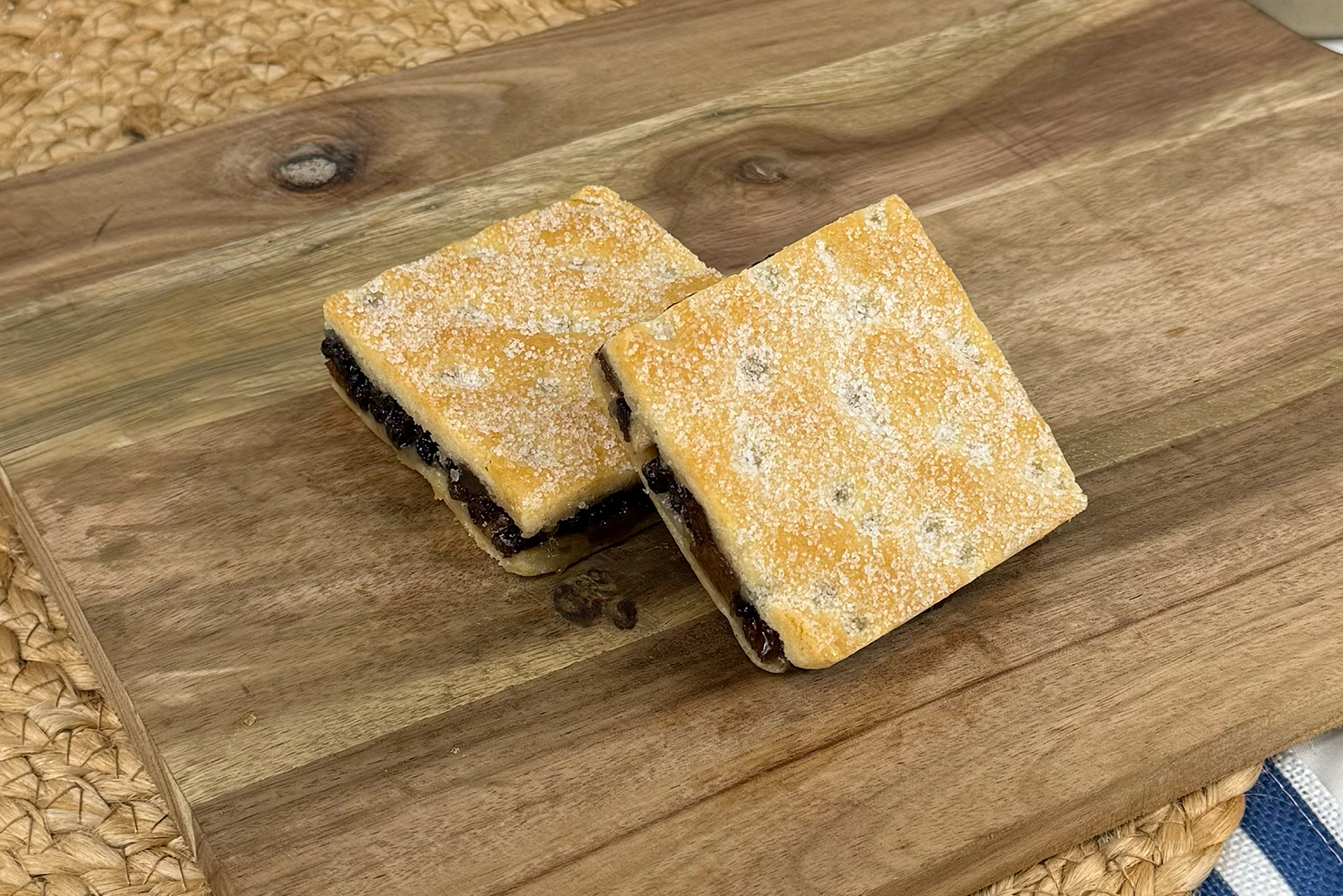 Shortcake pastry filled with sultanas, currants, and apple, dusted with sugar for a traditional fruit bake.