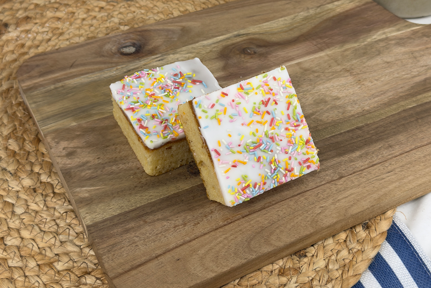 Soft vanilla sponge topped with fondant and colourful sugar strands, a nostalgic traybake loved by all ages.