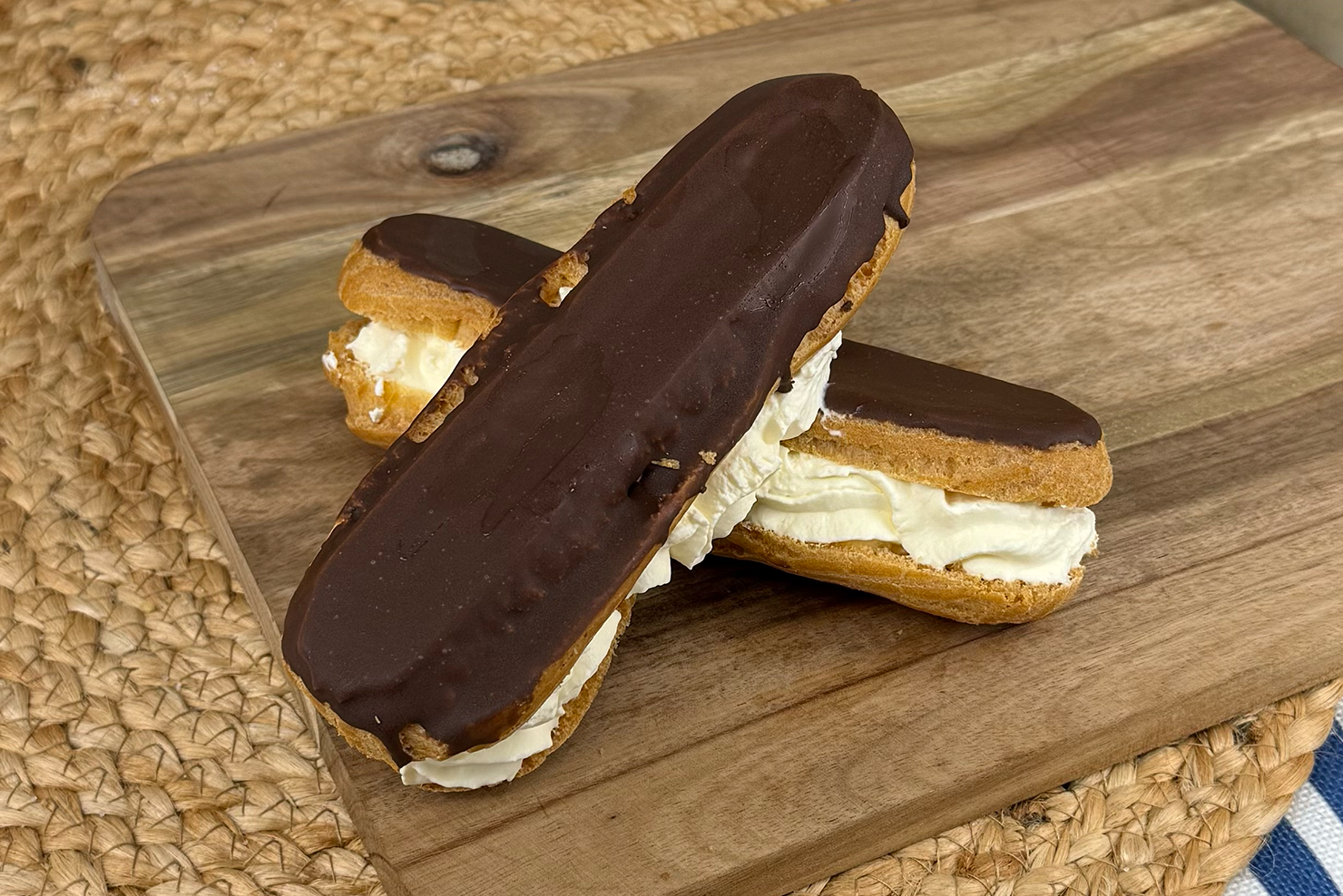 Choux pastry fingers filled with fresh cream and topped with rich chocolate, a bakery counter essential.