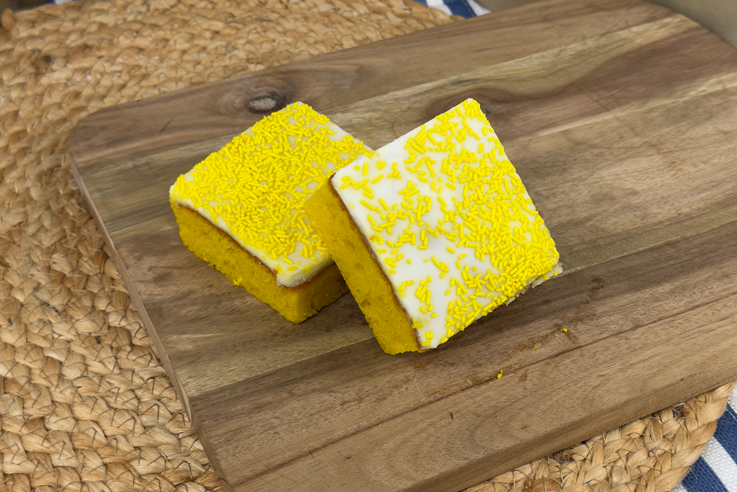 Citrussy sponge topped with lemon fondant and yellow sugar strands, fresh and zesty with every slice.