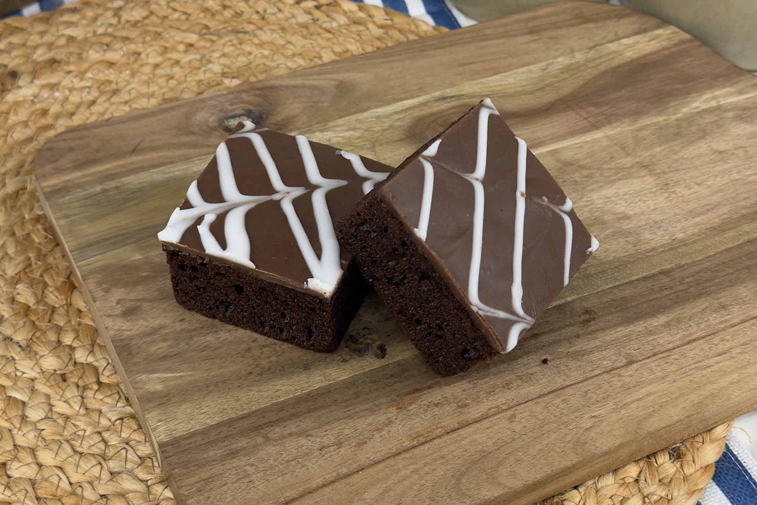 Rich chocolate sponge with chocolate chips, topped with chocolate fondant and feathered white icing for extra indulgence.