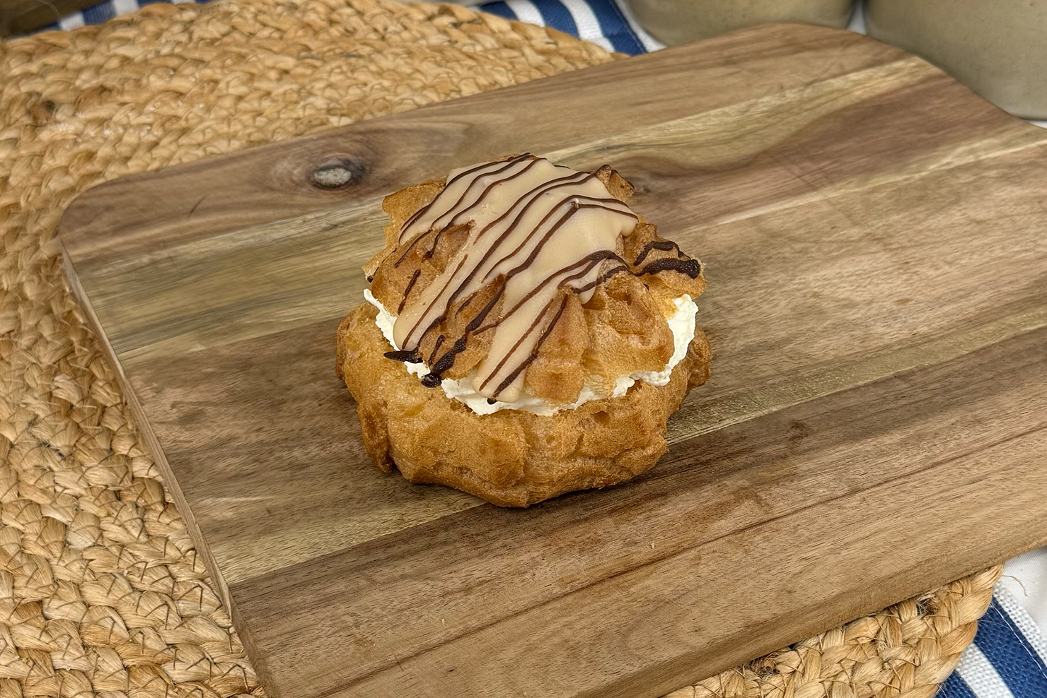 Choux pastry filled with custard and cream, topped with coffee icing and spun chocolate for a rich finish.
