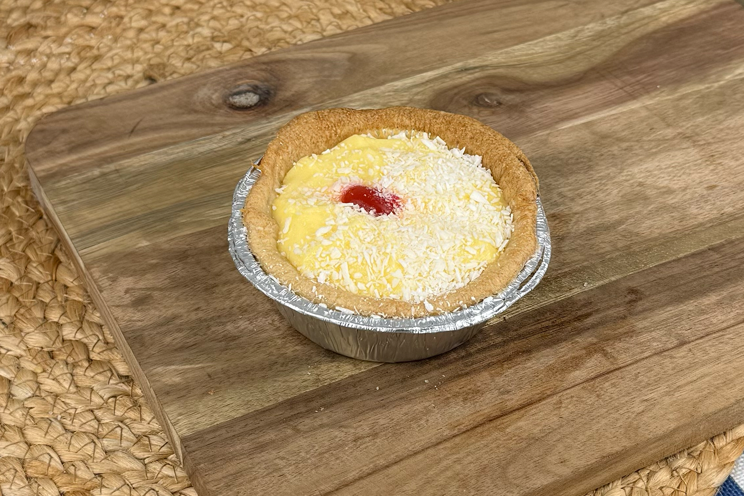 Shortcrust pastry filled with raspberry jam & custard, topped with coconut and glacé cherry — a true Lancashire fave.
