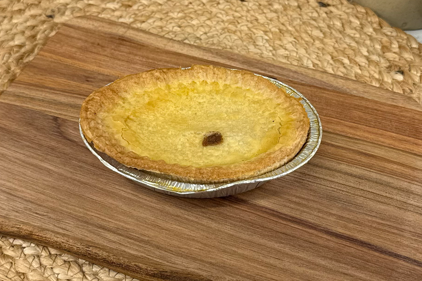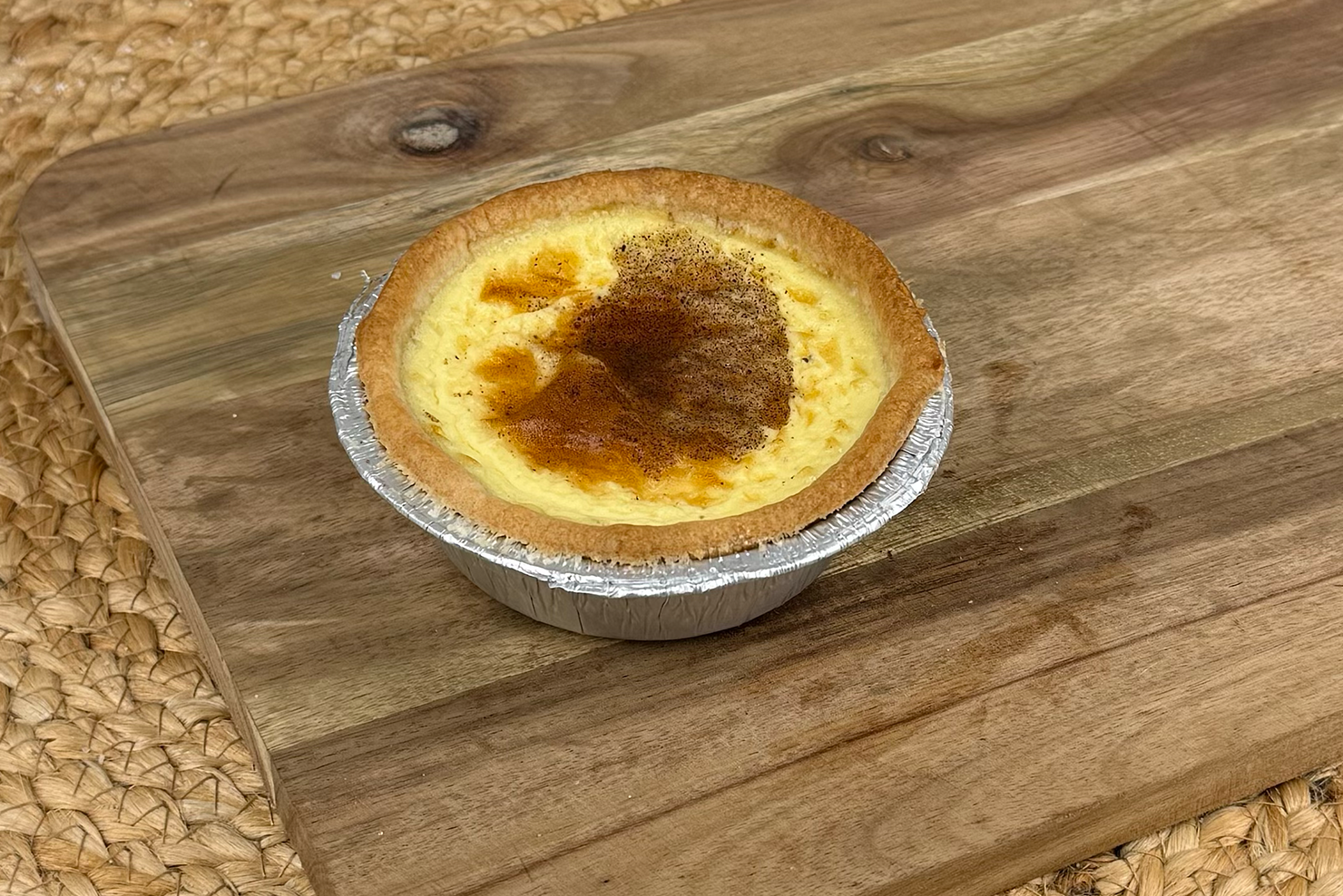 Smooth baked custard in golden shortcrust pastry, topped with nutmeg for a traditional handmade dessert.